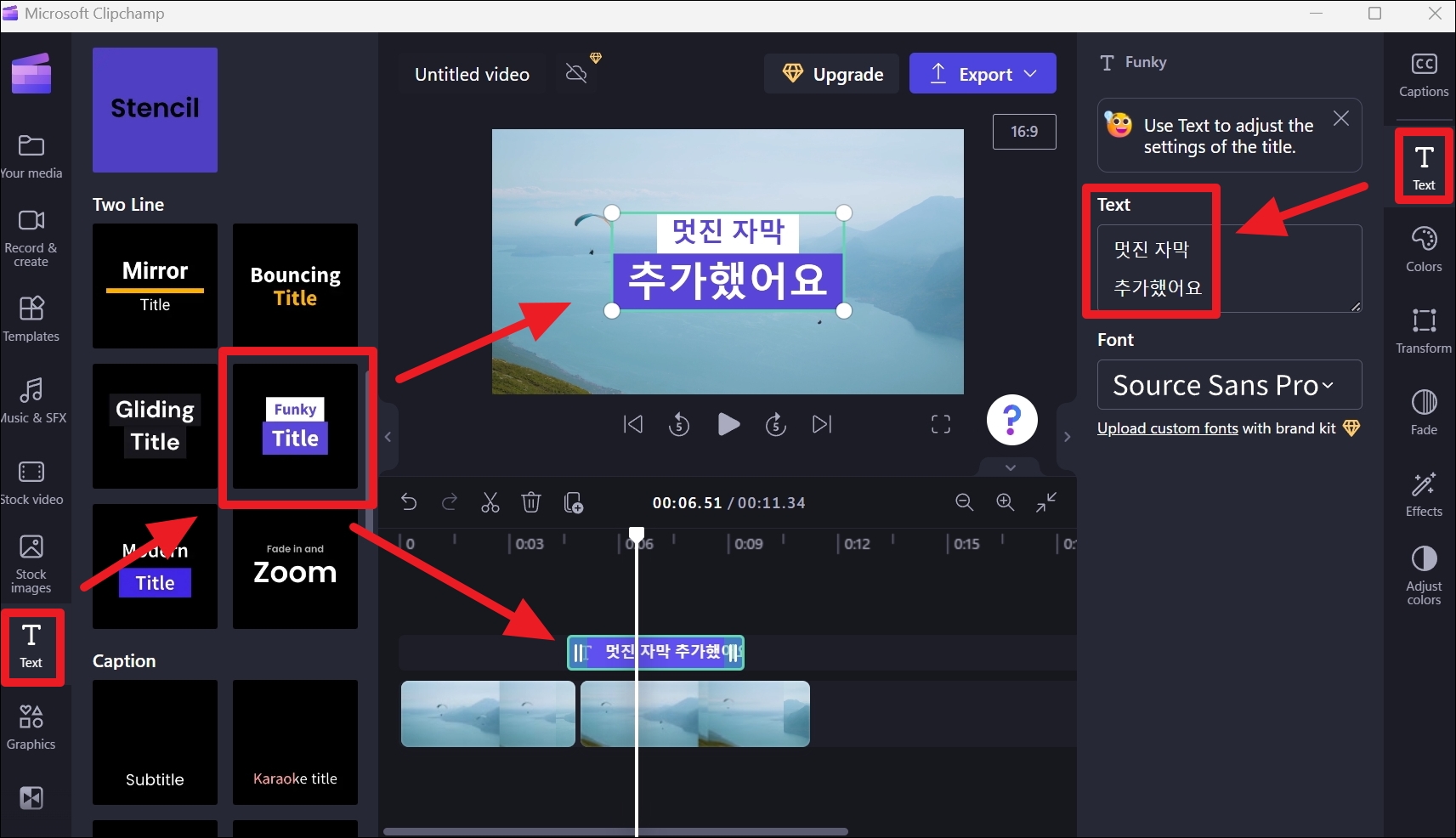 여기에서 가장 마음에 드는 것을 선택한 후 타임라인에 추가합니다. 이 상태에서 맨 우측에 보면 자막 관련 설정 버튼이 나타나는데요. 동영상 자막의 내용을 변경하거나 폰트 및 색상 등에 대한 수정이 가능합니다.